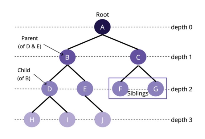 - ๊น์ด(Depth) : ๋ฃจํธ ๋ ธ๋์์ ํน์ ๋ ธ๋๊น์ง์ ๊ฑฐ๋ฆฌ