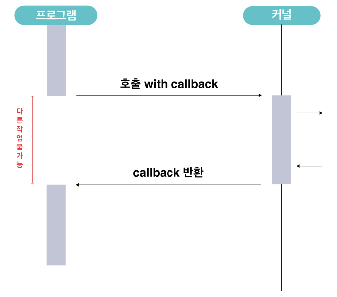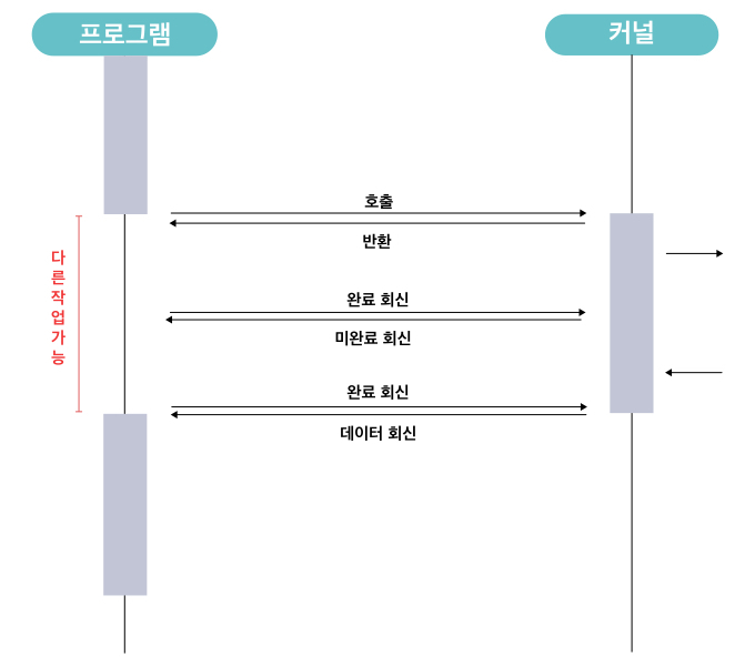 - 제어권을 호출된 함수에게 넘겨주지 않기 때문에(호출한 함수가 block되지 않기 때문에) 호출한 함수에서는 호출된 함수가 끝나기를 기다리면서 다른 작업들을 수행할 수가 있음