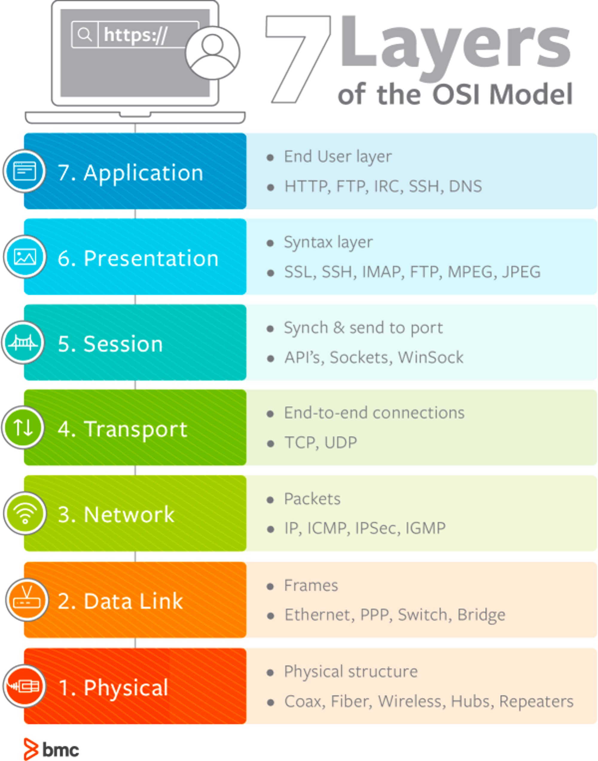 ๊ตญ์ ํ์คํ ๊ธฐ๊ตฌ(ISO)์์ ๊ฐ๋ฐํ ๋คํธ์ํฌ ํต์ ์ด ์ผ์ด๋๋ ๊ณผ์ ์ 7๋จ๊ณ๋ก ๋๋ ๊ตญ์ ๊ณ์ธตํ ํ์ค ๋ชจ๋ธ