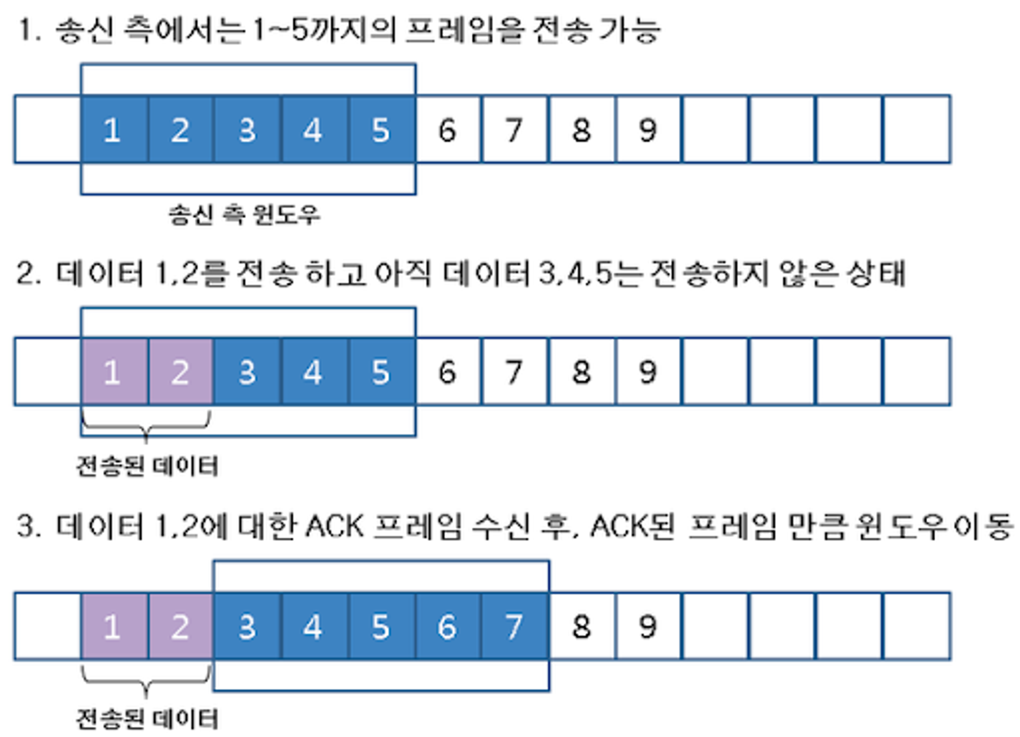 먼저 윈도우에 포함되는 패킷을 계속 전송하고, 그 패킷들의 전달이 확인되는대로 윈도우를 옆으로 옮김으로써 그 다음 패킷들을 전송