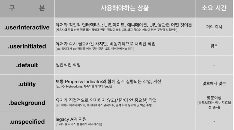let backgroundQueue = DispatchQueue.global(qos: .background) // 소요 시간: 몇분 이상(에너지 효율)