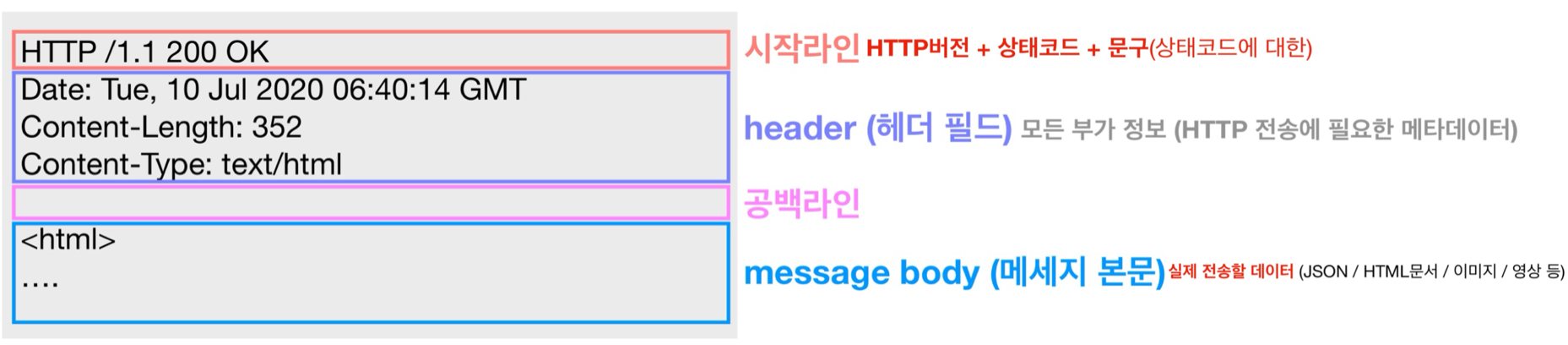 3. server는 해당 요청 처리 후 자신이 응답했다는 걸 client에 알리기 위해 HTTP 응답 메세지(상태 코드+데이터+기타 등등)를 client에게 보냄
